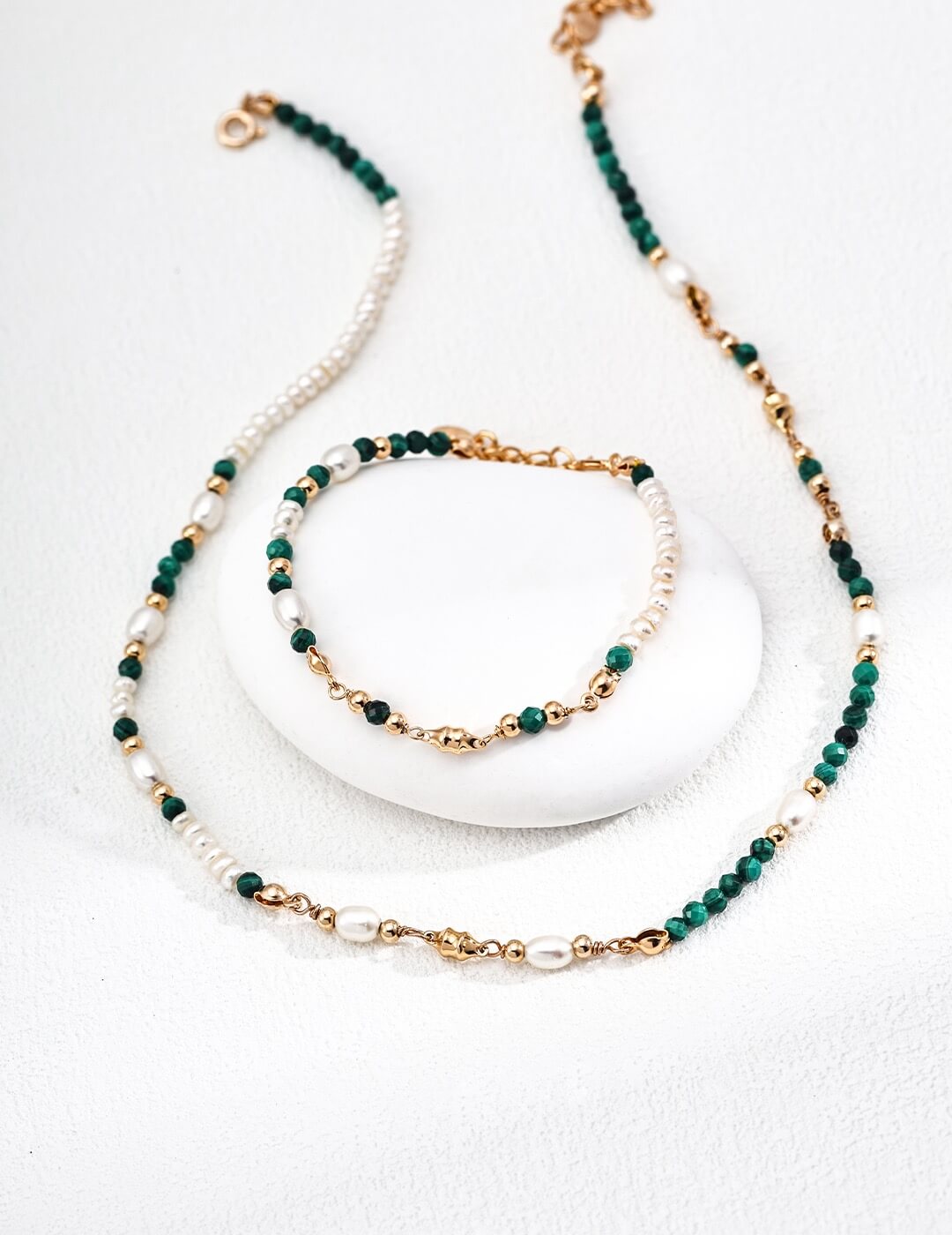This vintage-inspired set is crafted from S925 sterling silver with a retro gold finish, featuring natural pearls (3–5mm) and malachite beads (3mm). The necklace (38cm + 6cm extender) and bracelet (16cm + 3cm extender) are both adjustable for a comfortable, elegant fit.